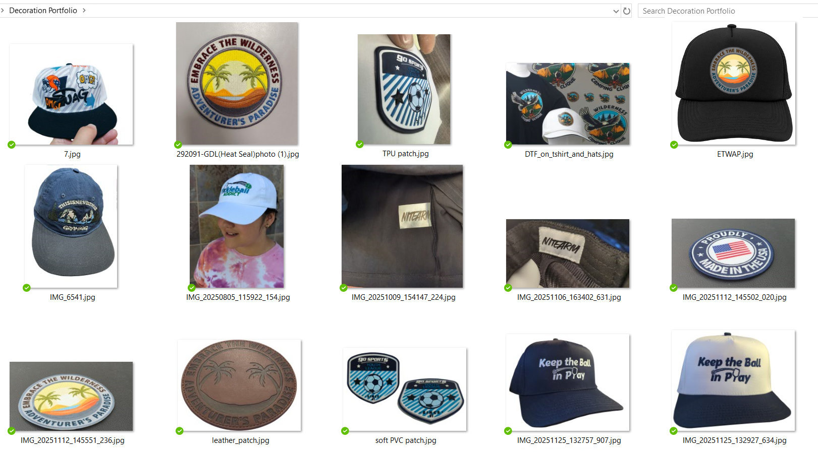 We offer a wide range of decoration services, including various patches, heat transfer (DTF) on shirts and hats, hat embroidery, and silkscreen printing on shirts. I have attached examples of our recent work for you to review.